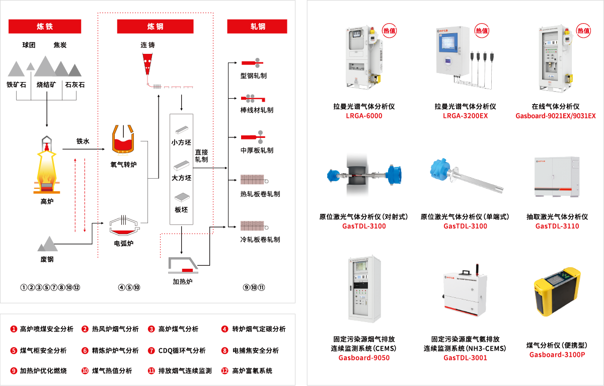 四方儀器憑借其先進(jìn)的氣體傳感器技術(shù)和豐富的工業(yè)監(jiān)測設(shè)備開發(fā)經(jīng)驗,針對鋼鐵行業(yè)精心打造了一套融合多種氣體傳感器技術(shù)的氣體監(jiān)測綜合解決方案,實現(xiàn)了對鋼鐵冶煉全流程(煉鐵、煉鋼、軋鋼等)的氣體監(jiān)測,精準(zhǔn)測量煤氣熱值、爐膛內(nèi)關(guān)鍵指標(biāo)以及環(huán)保限制因子等重要參數(shù),可有效評價爐內(nèi)燃燒狀態(tài),合理調(diào)節(jié)各種爐型的熱工參數(shù),從而助力鋼鐵行業(yè)的節(jié)能減排行動。